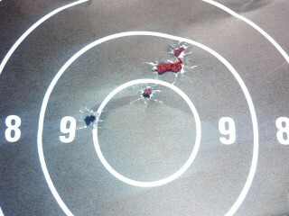 Na 200m vzdálenosti, výstřely 40-45, první rána vlevo, další 4 rány sly nahoru, ale byl jse tak unešený soustřelem, že jsem se vykašlal na snahu posunout to do desítky